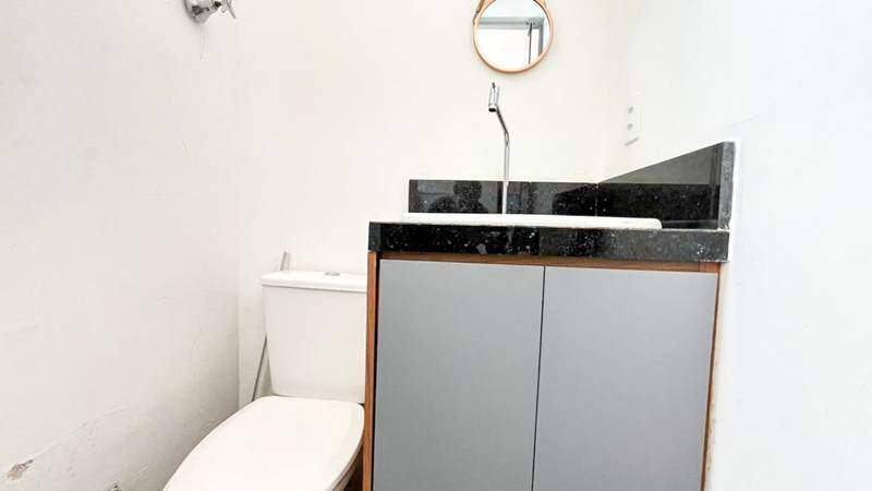 Banheiro social com pia em coluna, espelho, armários e box em blindex